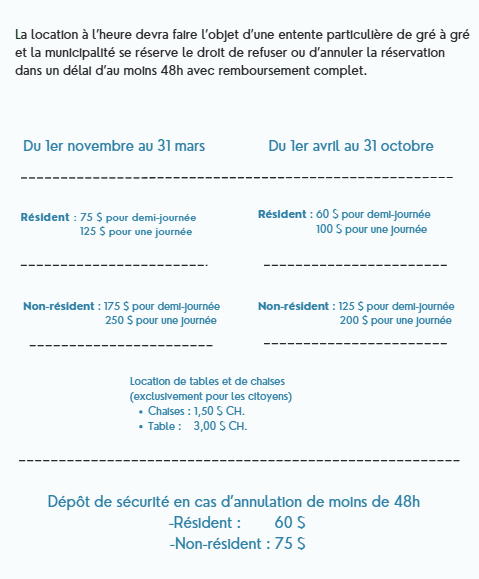 Notre salle communautaire, d’une capacité de 100 personnes, est l’endroit idéal pour un événement privé : atelier, mariage, conférence, réception, lancement ou tout autre rassemblement familial, associatif ou corporatif. Elle est équipée d’Internet, d’un système de son, d’un réfrigérateur, d’une cuisinière, d’un four à micro-ondes et d’un système de son (amplificateur pour MP3, tablette, téléphone et 2 haut-parleurs).